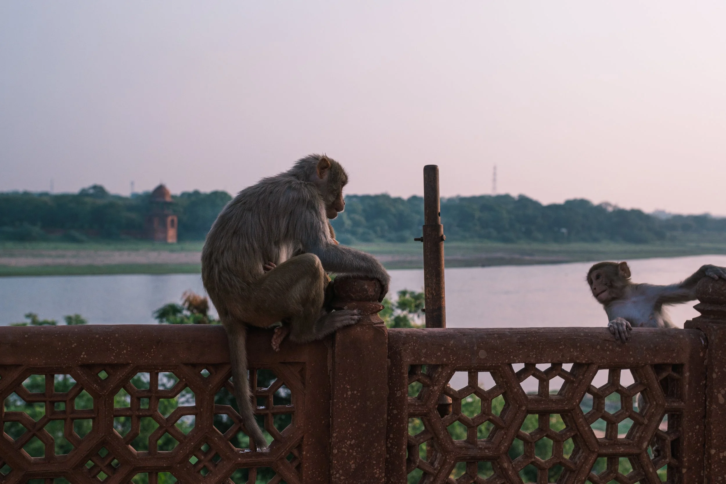 These monkeys were hanging out along the walkway behind the mausoleum, facing the river.